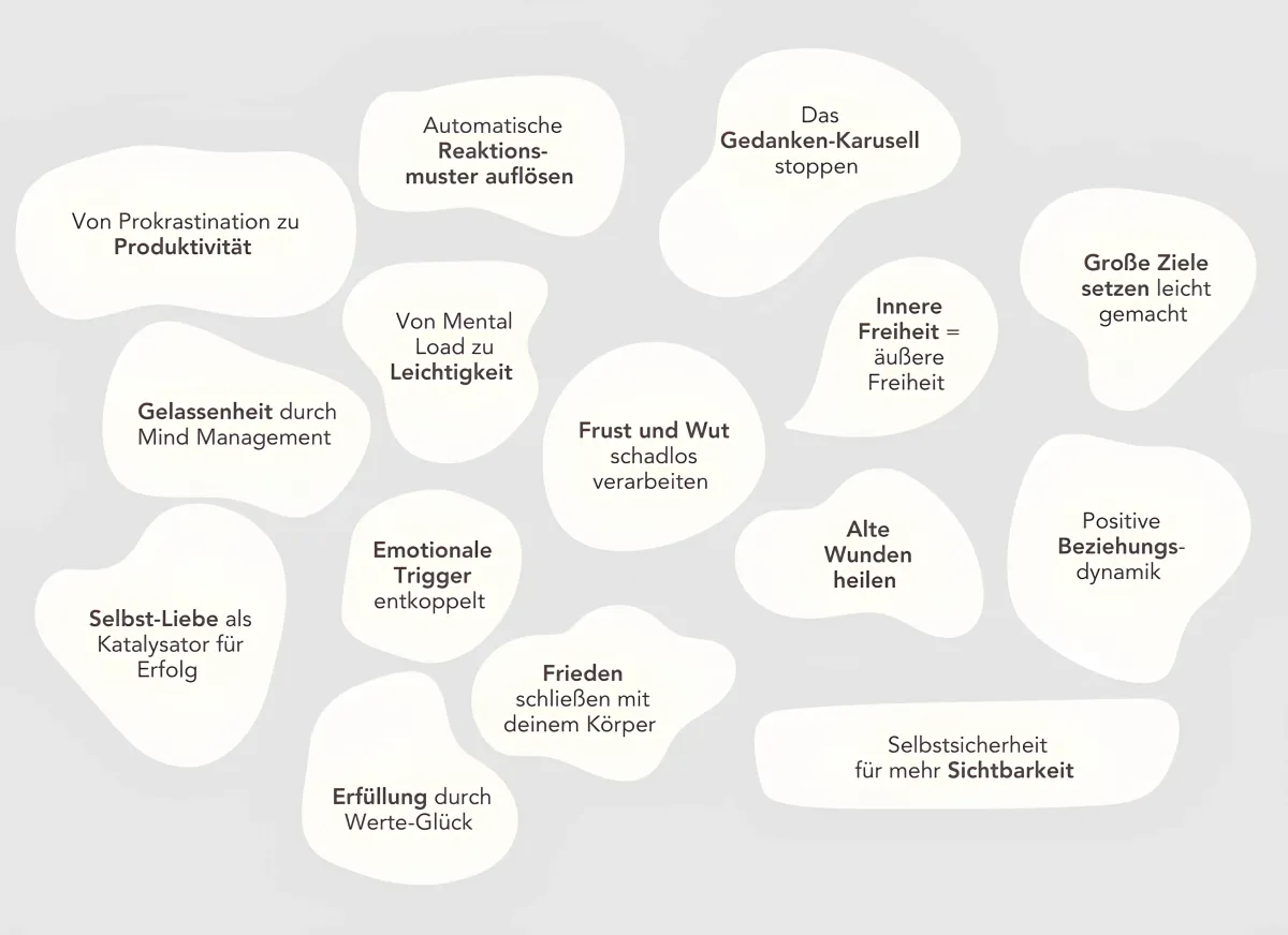 Einfach anwendbare, wirksame Methoden – und die passenden Anleitungen, die Spaß machen! Das bringt dich in die Umsetzung im Alltag. So bist du nicht nur inspiriert, sondern merkst jeden Monat eine Veränderung. Raus aus dem Kopfkarussell und voller Leichtigkeit rein in dein neues Leben.